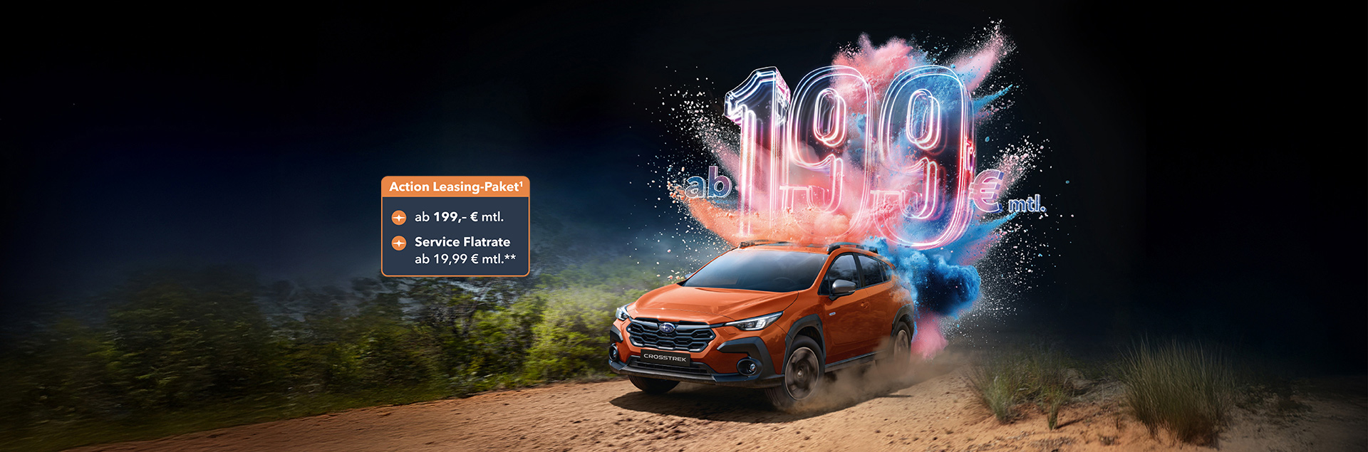 1 Die Aktion gilt vom 01.10.2025 bis 31.12.2025 in Verbindung mit dem Leasing eines aktuellen Subaru Crosstrek (Modelljahr 2024) (Neu- oder Vorführwagen), Zulassung/Besitzumschreibung bis 31.12.2025 bei teilnehmenden Subaru Partnern. Die Aktion wird von der SUBARU Deutschland GmbH getragen und ist nicht mit anderen Aktionen der SUBARU Deutschland GmbH kombinierbar mit Ausnahme des Aktionsangebots zur Service-Flatrate. Weitere Detailinformationen erhalten Sie bei Ihrem teilnehmenden Subaru Partner oder unter www.subaru.de. Subaru Crosstrek MJ24 Trend Leasingbeispiel (gültig bis 31.12.2025): Anzahlung 0,00 EUR, monatliche Rate 199 EUR, Laufzeit 24 Monate, Laufleistung p. a. 10.000 km, zzgl. Überführungskosten 850,00 EUR, Gesamtpreis (inkl. Überführungskosten) 5.626,00 EUR, Freibleibendes Leasingangebot der SUBARU Finance, Ein Service der MCE Bank GmbH, Schieferstein 9, 65439 Flörsheim. Alle Preise verstehen sich inkl. Umsatzsteuer.